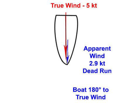 As we turn through a broad reach and get the wind behind us for the first time, everything seems to slow down. That's because when the wind is behind us, our boat speed cancels some of the true wind, so the apparent wind speed slows down. Note that here it's less than half of the apparent wind close-hauled with the same true wind. If you're racing, you'd better be prepared for a big increase in apparent wind speed as you round the leeward mark.