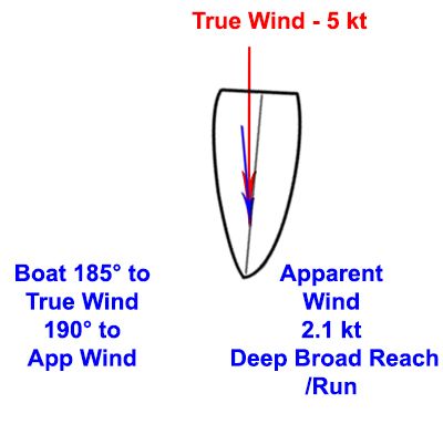 Note that the boat is about 5 degrees off dead downwind to the true wind, but 10 degrees off dead downwind to the apparent wind.