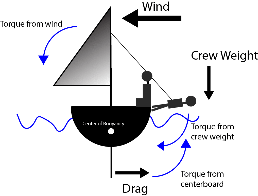 In other words, if we focus on the rotation portion, the torque counteracting the wind and water comes from the crew weight (or the lead at the bottom of the keel in a keelboat). Torque is force multiplied by length, so getting your weight out of the boat more, such as being on the trapeze or hiking, benefits your righting moment dramatically. This is part of the reason sails are lowered when it’s windy, it reduces the heeling force (torque) on the boat. Likewise, you can do this by lifting your centerboard to “reef” your centerboard. This, like a reefing a sail, both reduces the area as well as the length over which this force is acting.