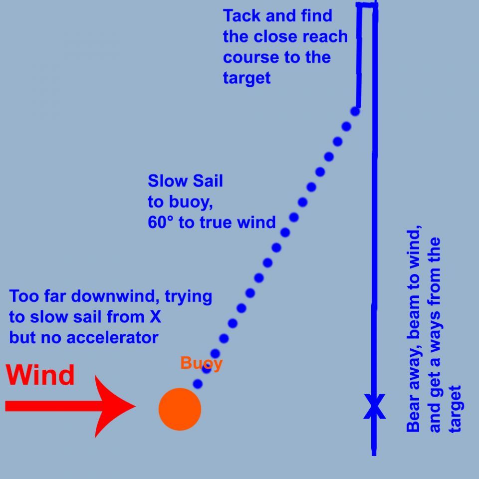 a buoy) with zero speed. The idea is to come in on a close reach course, where you have an accelerator and a brake.