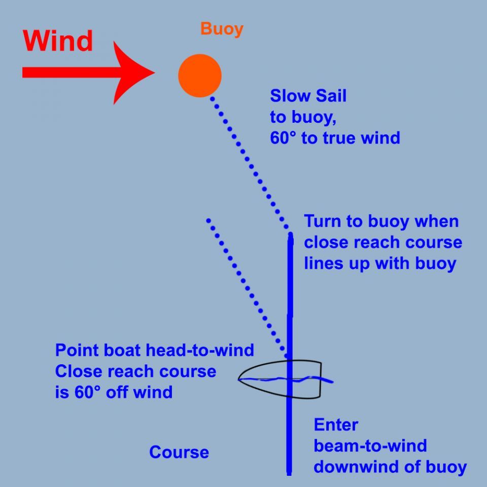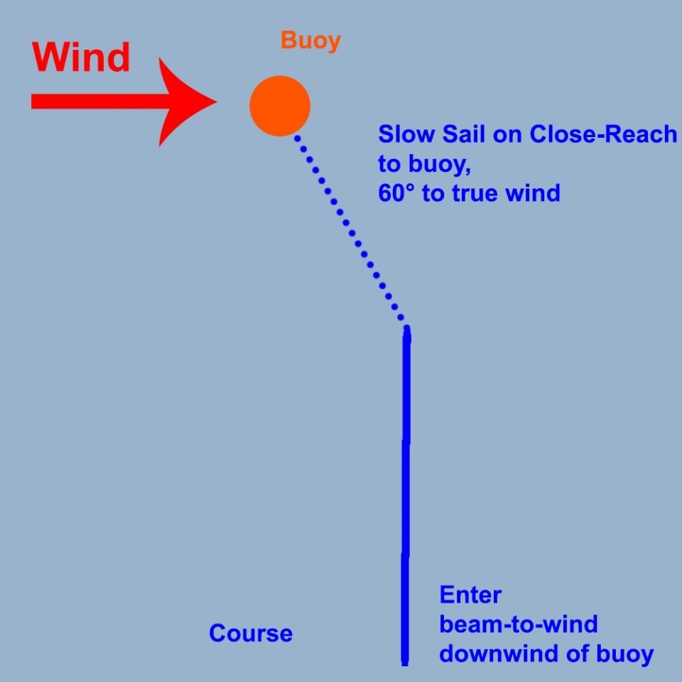 You come in beam-to the wind, downwind of the buoy, and you turn upwind to find the close reach course to sail to the buoy and slow sail to it. But where do you turn upwind to do this?